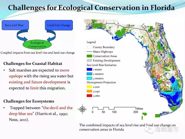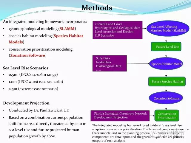 我所关注主要的一个小的方面,生态保护怎么应对呢?要面对两个威胁,一个就是气侯变化的威胁,我在这个地方主要是关注海平面上升。另外一个是土地应用快速变化也是因为人口的增长而引起的。我研究的问题现在沿海的保护区,大家知道我们中国在沿海也有保护区,他们面对的一个非常现实的问题,他们保护区需要增加或者是需要增加新的保护区来应对气侯变化,我们保护区应该怎么调整呢?或者我们城市的规划应该怎么调整来应对气侯变化呢?这是他们所关注的问题,我们研究就是在一个全球佛罗里达州的来研究怎么样应对海平面上升,具体的技术方面我就不讲了。