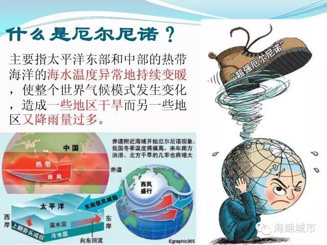 我们城市首先一个原因,我把他归结为我们城市规划设计的不当和我们城市防洪排涝设施的不足,因为他没有考虑到超过排水设计标准部分的地表洪径流的合理梳排及管理。我们忽略了造成目前这个状况的元凶是什么?我们看到元凶就是全球气候变化,具体来说就是厄尔尼诺变化。