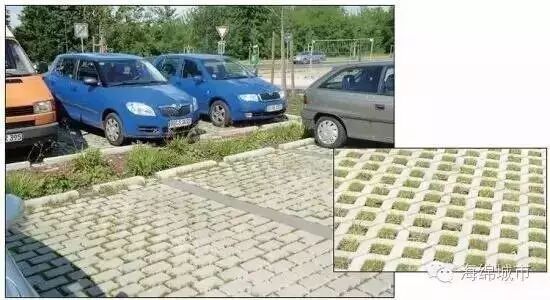 选择有孔的混凝土砖,并在砖孔中用土填充,这样有利于杂草生长,从而使这些地面的40%有绿化功能。