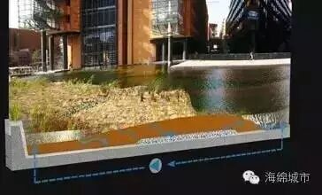 沿着排水道修建这种表面只有草皮的可渗透浅沟,供雨水径流时下渗。超过渗透能力的雨水则进入雨洪池或人工湿地,作为水景或继续下渗。类似的滤水沟或地下水库在柏林有100多个,可同时储存雨水90万立方米。雨水经过沉淀、滤去颗粒污染物后,再排到处理厂处理。